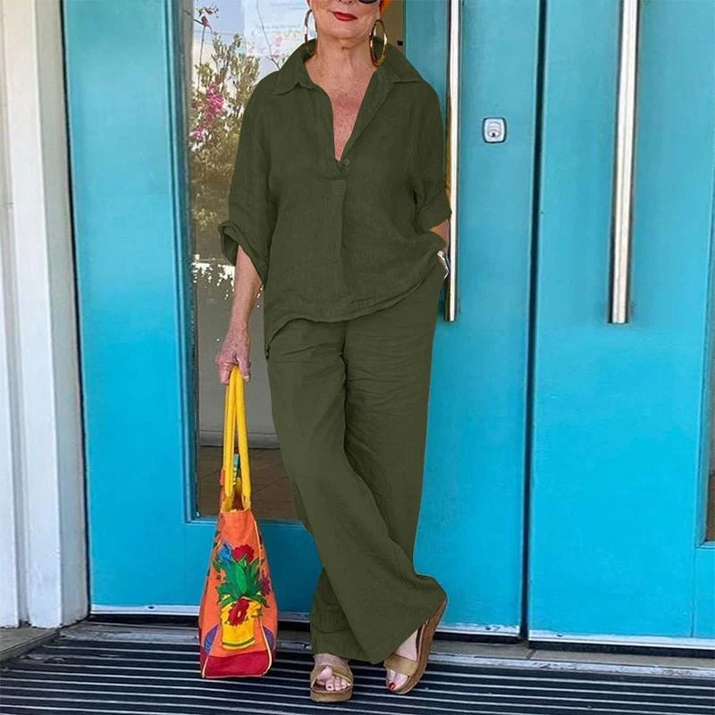 Das Corena - Stylisches Blusen- und Hosen-Set ist ein vielseitiges Zweiteiler-Ensemble für einen eleganten Look. Die schmeichelhafte Bluse und die maßgeschneiderte Hose bieten Raffinesse und Komfort für Arbeit, Treffen oder Abendessen.