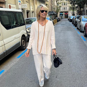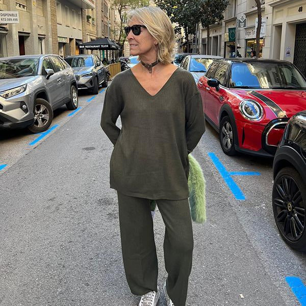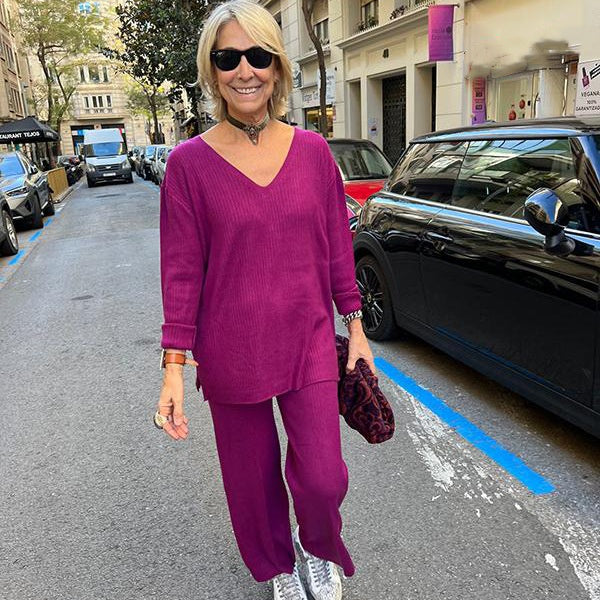 Das beliebte Maren 2-teilige Set vereint Stil und Komfort. Dieses Bestseller-Ensemble besteht aus einem schmeichelhaften V-Ausschnitt-Top und weit geschnittenen Hosen – ideal für jede Gelegenheit. Ein bequemes, schickes Outfit für den ganzen Tag.