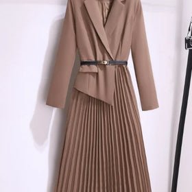 Elegantes Plissee-Blazerkleid für einen besonderen Look. Klassische Blazerstruktur trifft auf fließenden Plisseerock – zeitgemäßer, raffinierter Stil. Der Taillengürtel betont die Silhouette. Ideal für besondere Anlässe, Geschäftstreffen etc. – ein Must-have für stilbewusste Frauen.