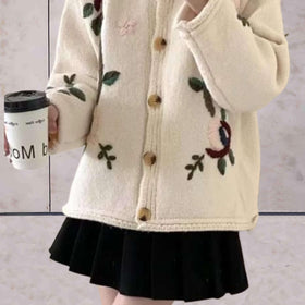Stil und Wärme mit dem Ermana Floral Knit Cardigan. Dieser Cardigan wurde für alle entworfen, die sowohl Komfort als auch Eleganz schätzen, und bringt ein Vintage-inspiriertes Blumendesign in Ihre Alltagsgarderobe.