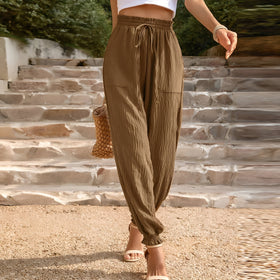 Evelyn Hosen im Vintage-Stil: gesmokte, hohe Taille, gerades, weites Bein, locker sitzende Lounge-Hose mit Taschen, Strandhose aus Leinen für Frauen. Eine fließende, bequeme und schicke Hose.