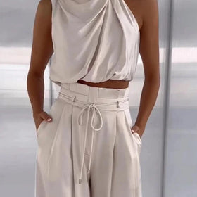 Heben Sie Ihren Stil mit Lore, dem Inbegriff von Luxus und Raffinesse. Dieses zweiteilige Set bietet eine Mischung aus Eleganz, Komfort und Professionalität, ideal über die typische Bürokleidung hinaus. Aus hochwertigem Polyester gefertigt, strahlt es Langlebigkeit und luxuriöses Tragegefühl aus. Das ärmellose Oberteil mit hohem Halsausschnitt sorgt für Raffinesse, während die ausgestellte Hose Ihrem Look Weiblichkeit und Fluidität verleiht.