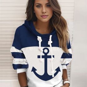 Eleganter Anker-Kapuzenpullover im Farbblock-Design mit königsblauen und weißen Streifen. Kuschelig weich mit langen Ärmeln und Kapuze mit Kordelzug. Perfekt für Abenteuer oder Entspannung.