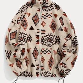 - Material: Weicher Fleece-Stoff, warm, komfortabel, leicht und atmungsaktiv. - Design: Auffälliges geometrisches Muster, Reißverschluss vorne, hoher Kragen. - Passform: Lockere Passform, Bewegungsfreiheit. - Taschen: Seitentaschen.Hauptmerkmale: