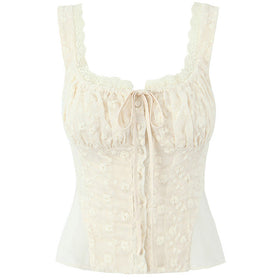 Floral Embroidered Lace Bow Button-Up Chiffon Peplum Crop Tank Top by Fudus