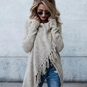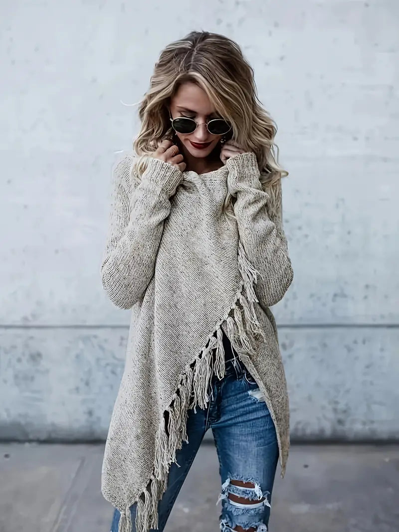 Ein wunderschön gestrickter Pullover vereint Wärme und Stil – perfekt für kühle Herbst- und kalte Wintertage. Elegantes Design mit Rollkragen und stylischem Fransenbesatz am Saum für mühelos schicke Outfits.