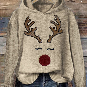 Fudus: Bequemer Strick-Hoodie mit Weihnachts-Rentier-Gesichts-Stickerei