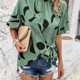 Fudus Bluse mit hohem gerafften Ausschnitt, kurzen Ärmeln, abstraktem Druck und lässigem Schnitt, inklusive verstellbarem Taillenzug