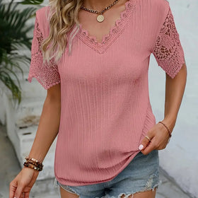 Fudus Bluse: Mühelose Eleganz durch kontrastierenden Spitzen-V-Ausschnitt
