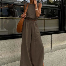 Fudus braunes Baumwoll-Crop-Top ohne Ärmel und hochgeschlossene Hose mit Schlitz