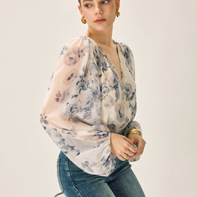 Fudus Chiffon Bluse mit Blumenmuster, V-Ausschnitt und Ballonärmeln, halbtransparent
