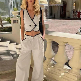 Fudus cremefarbenes ärmelloses Baumwoll-Crop-Top und -Hose Set