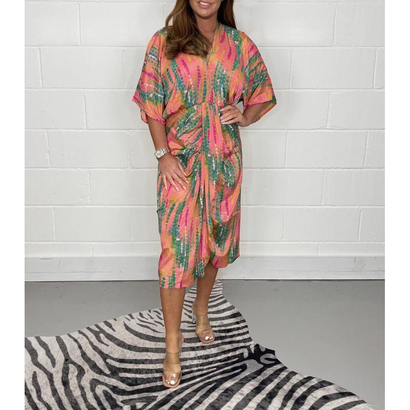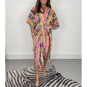Professionelle Kleidung, Einteiler, Maxi Rock, V-Ausschnitt. 3D/Dreidimensionales Muster, Pullover Stil, reguläre, kurze Ärmel. Drucktechnik.