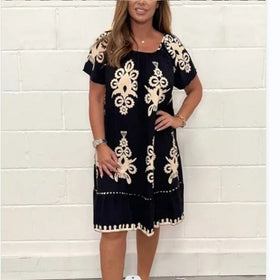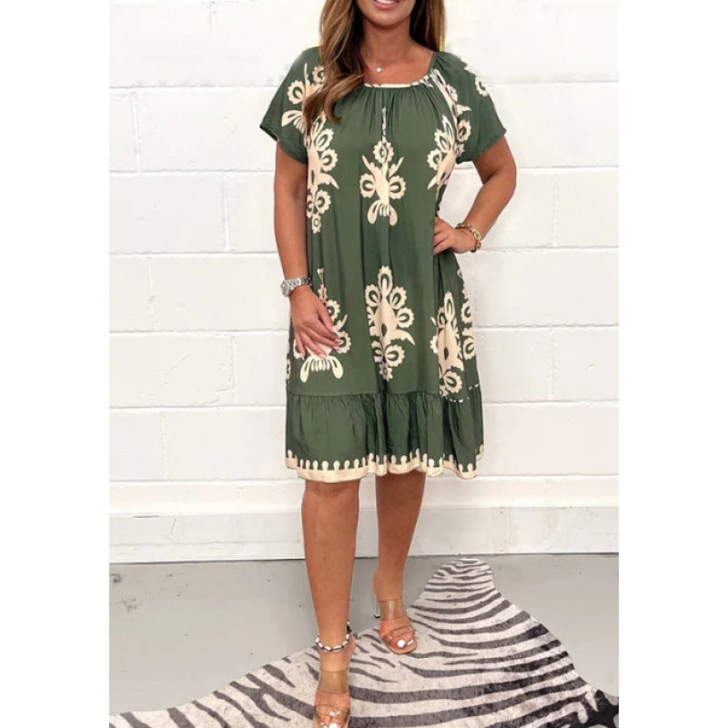Schicker Pendler-Kleid, einteilig. Midi-Rocklänge. Runder Halsausschnitt. Farbiger Druck. Pullover-Design. Standardärmel, kurz. Anspruchsvoller Stil. Bedruckte Verarbeitung.