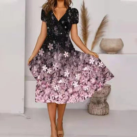 Elegante Alltagskleidung. Hauptmaterialkomponente 2: Spandex. Einteiler. Midi-Rock. V-Ausschnitt. Blumenmuster. Kurze Ärmel. Kleid. Alltags-Stil. Druck/Färben.