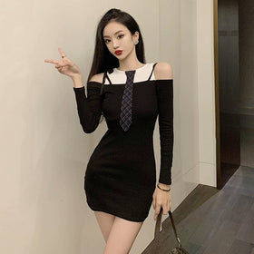 Fudus Farbblock A-Linie Kleid mit Carmen-Ausschnitt und Taillenbund