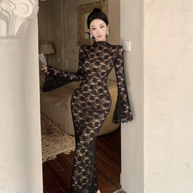Fudus figurbetontes Fischschwanz-Bodycon-Kleid mit Glockenärmeln und hoher Taille