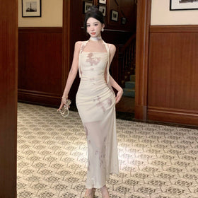 Schickes Neckholder-Kleid im Halter-Stil. Langes Kleid mit Rückenausschnitt und ärmellos. Pullover-Verschluss. Patchwork-Verarbeitung. Sexy Stil.