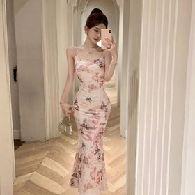 Privates Kleid, Einteiler, langer Rock, schulterfrei, offener Rücken. Spaghettiträger, Pullover-Verschluss, ärmellos. Sexy Stil, Patchwork/Splicing.