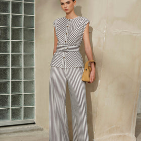 Fudus gestreiftes Rundhals-Hemd mit Gürtel aus Metall