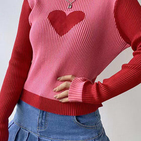 Fudus Gestricktes Mock-Neck Oberteil mit Herzgrafik und Rippenstruktur