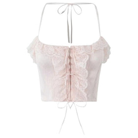 Fudus Halsband mit Schleifenknoten, Haken und Öse, zerknittertes Crop Top mit Spitzenbesatz