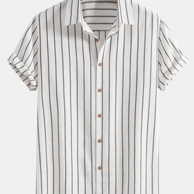 Fudus Kurzarmhemd: Atmungsaktives Baumwoll-Leinengewebe, vertikal gestreift, mit Knopfleiste