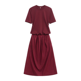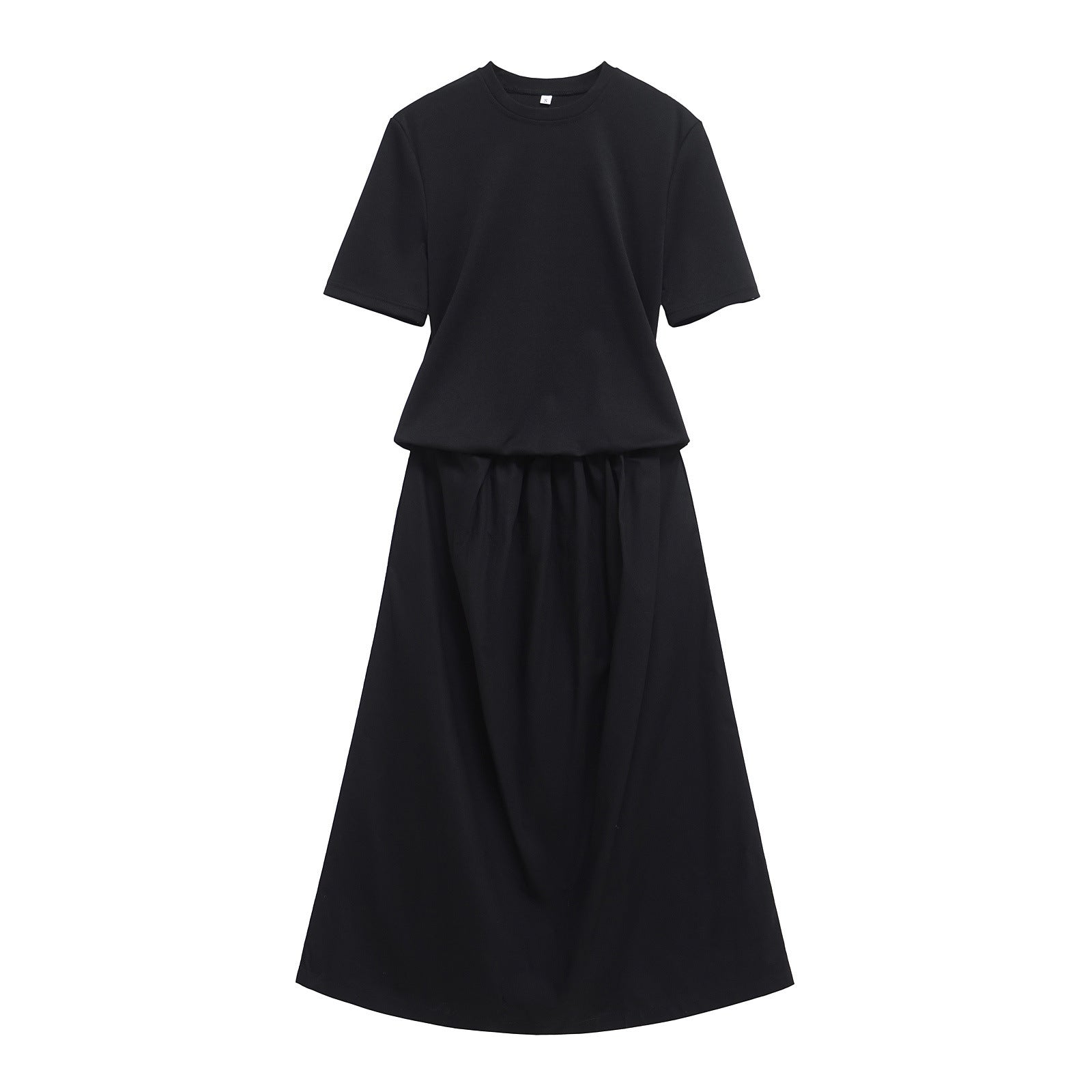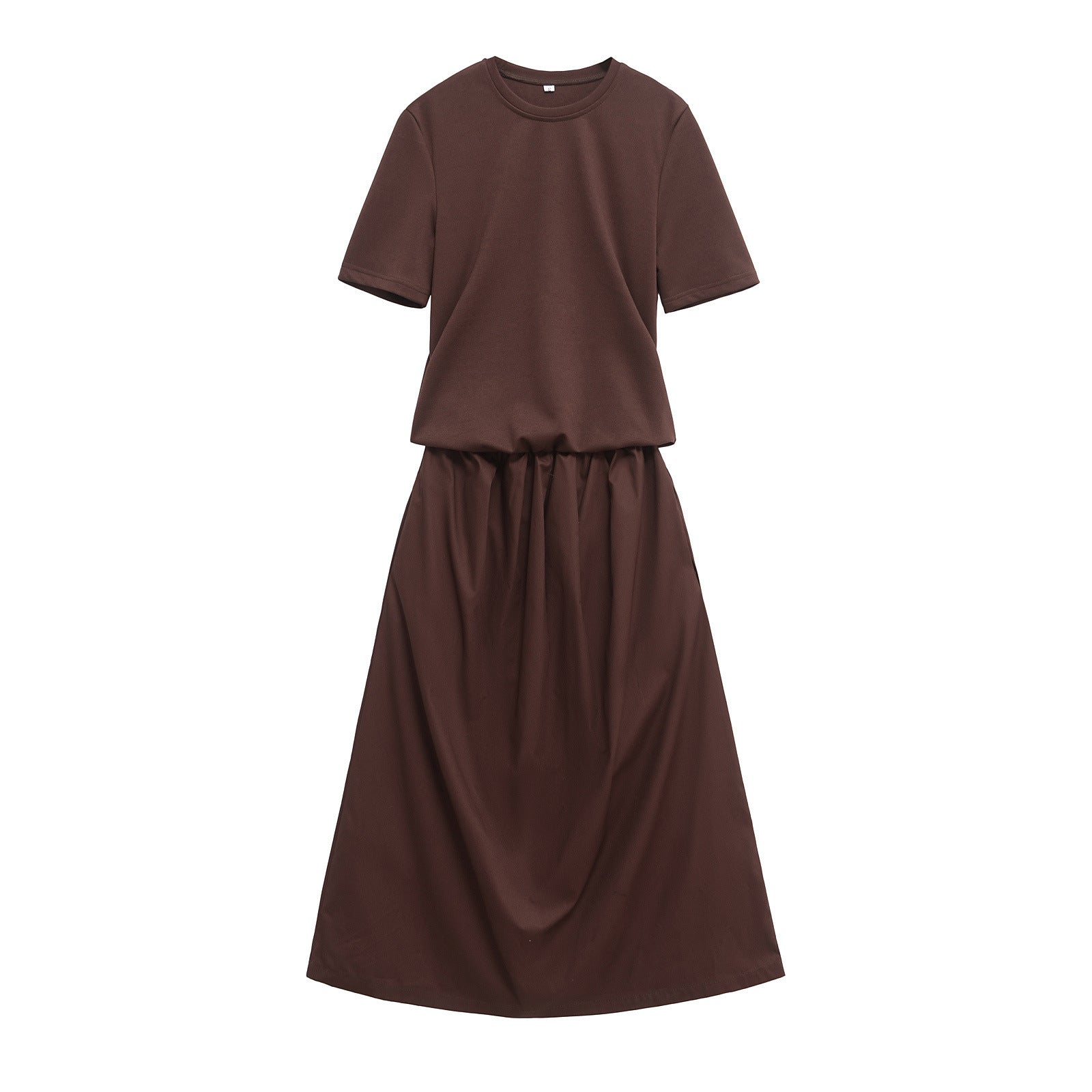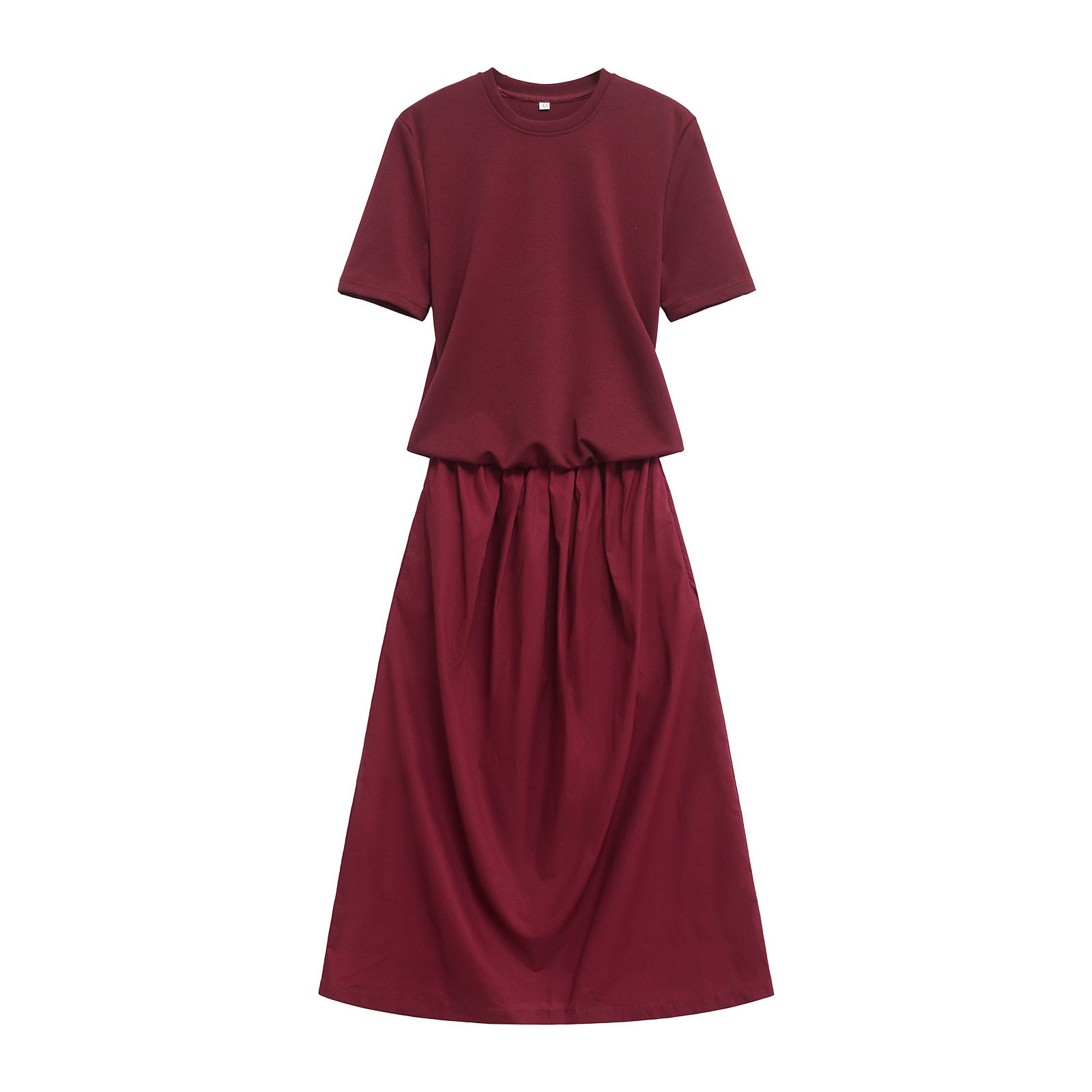 Einfarbiges A-Linien-Design. Bodenlanger Rock. Runder Ausschnitt. Kurze Ärmel. Material: Patchwork/Genäht