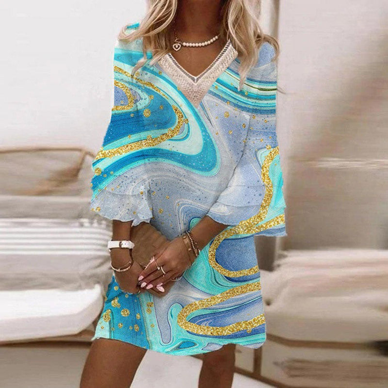 Elegantes Pendelkleid, einteilig, Midi-Länge. V-Ausschnitt, Spitzendetails. Essentialer Stil, Schlupfmodell, Dreiviertelärmel. Bedrucktes Design.