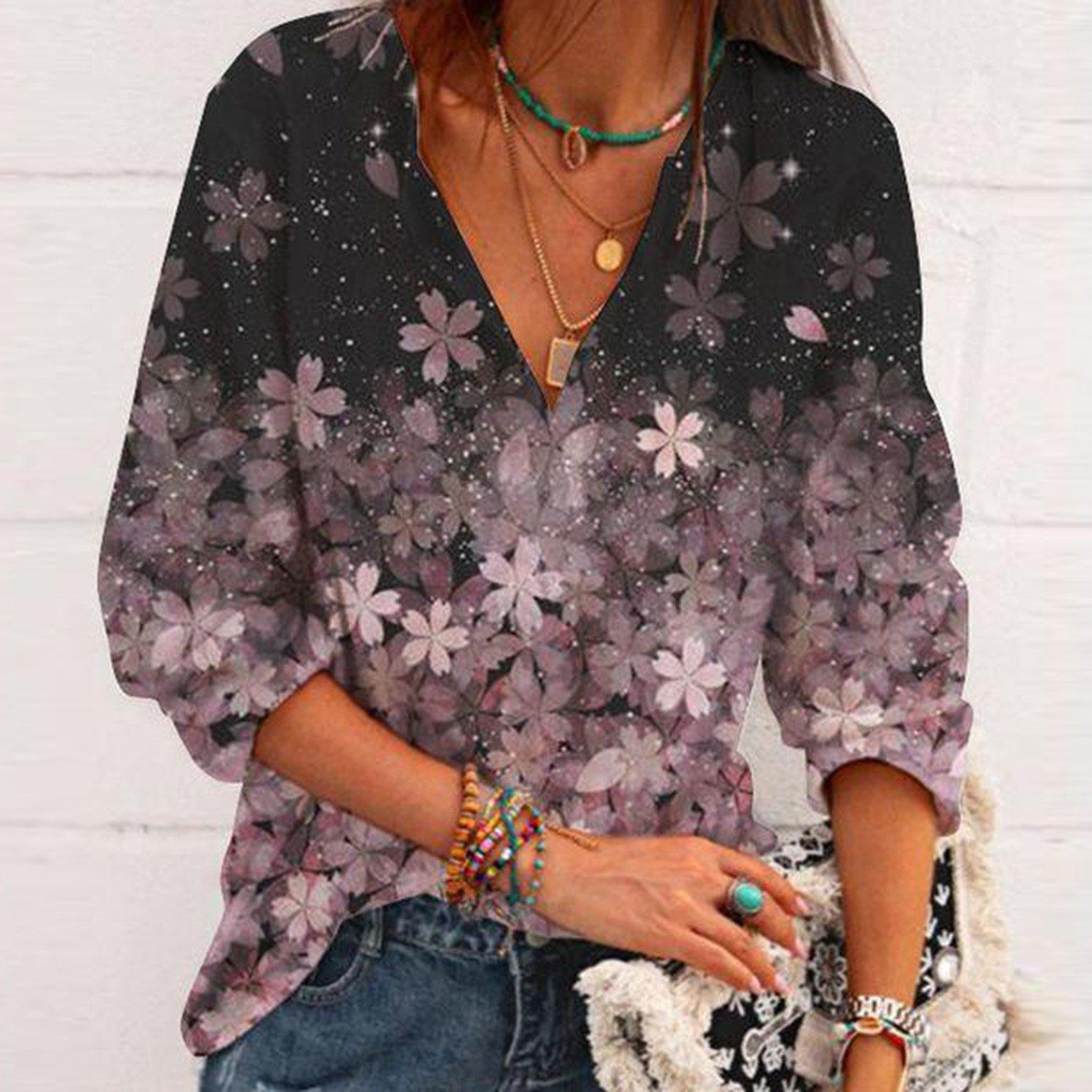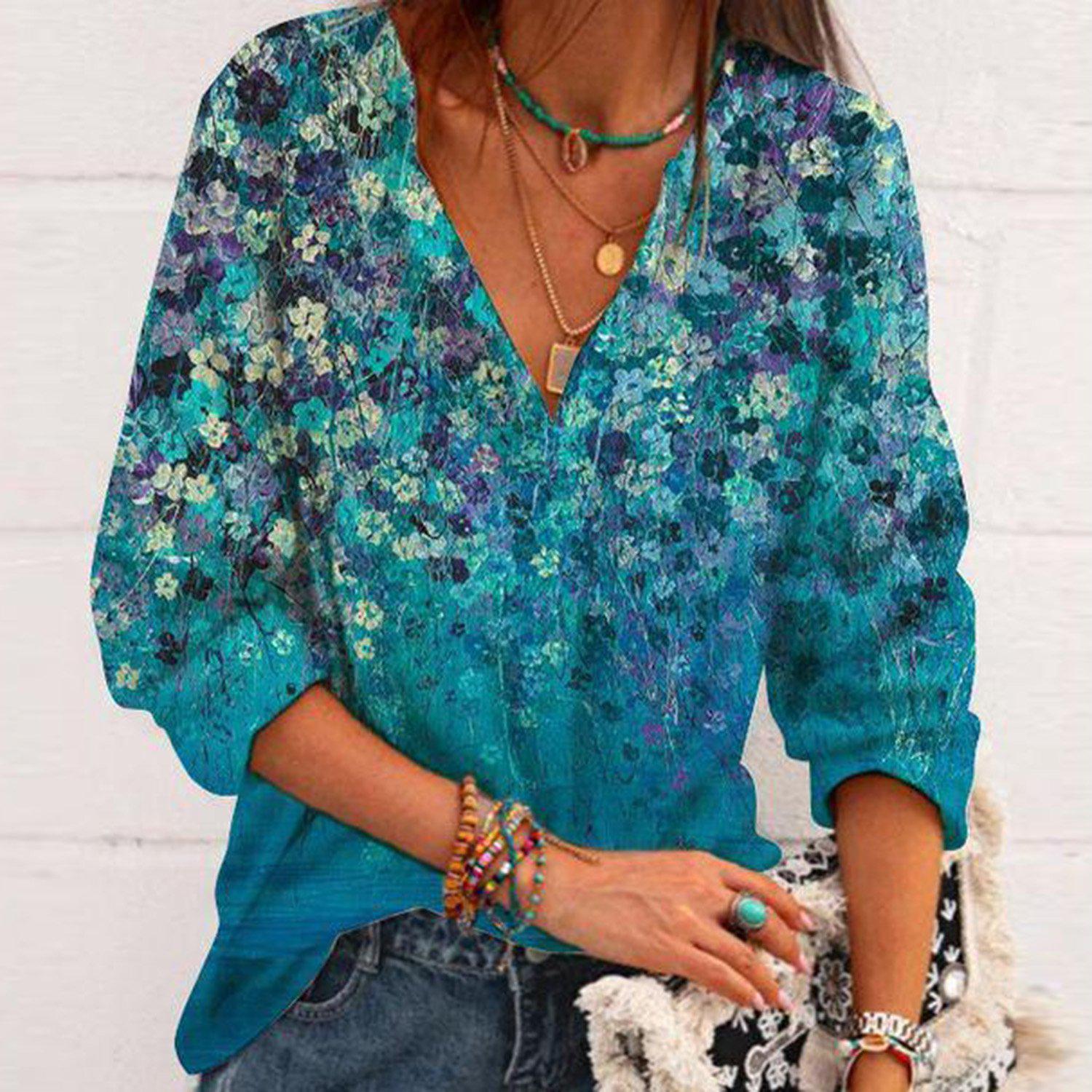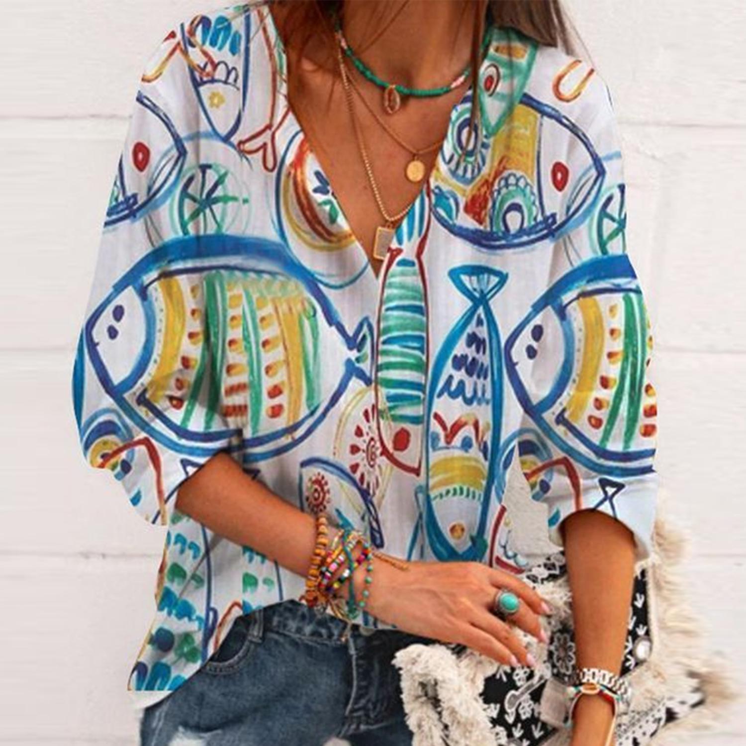 Fudus modischer Druck V-Ausschnitt, elastische 3/4-Arm Bluse