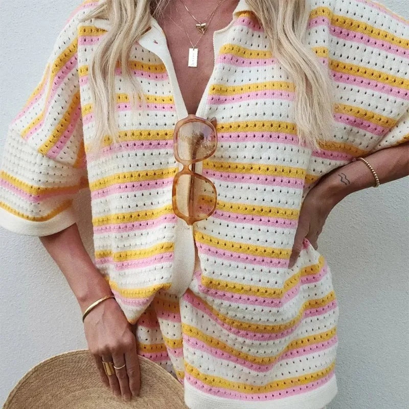 Fudus Oberteil und Shorts mit Kontrastfarben, Reverskragen und Streifen