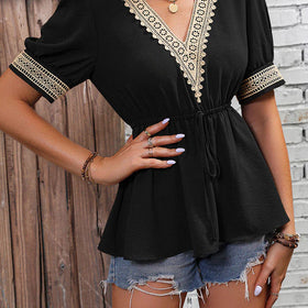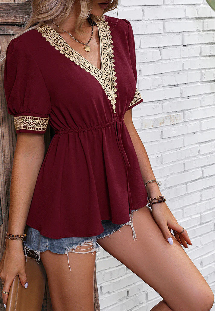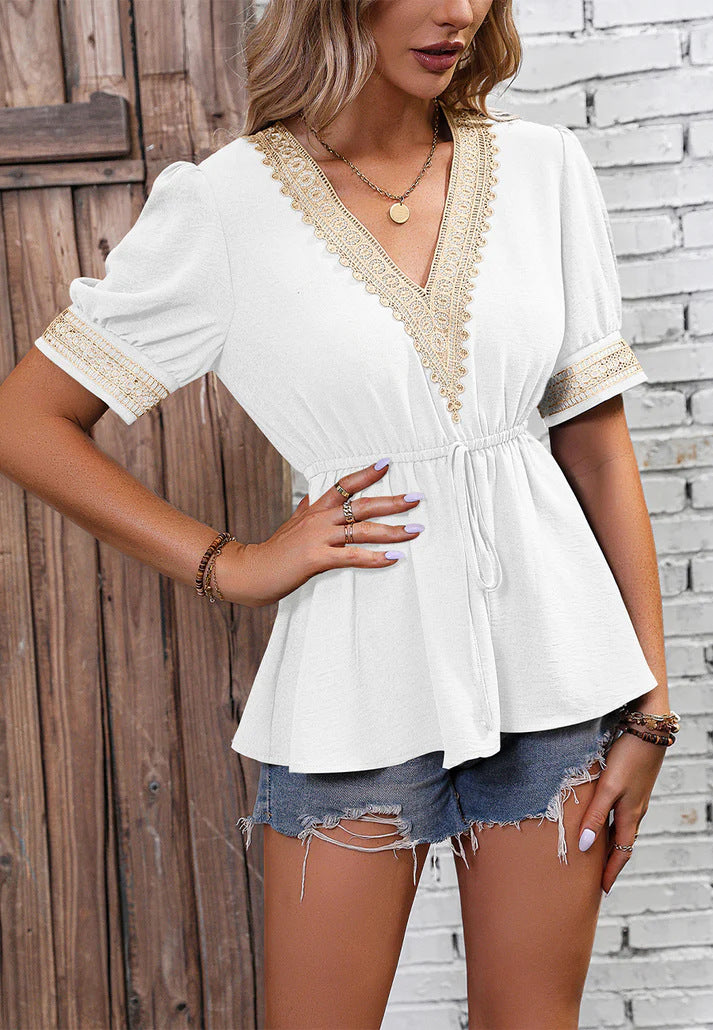 Fudus: schickes Kurzarm-Spitzen-T-Shirt mit V-Ausschnitt für den Sommer