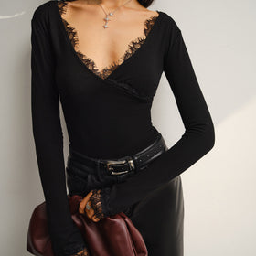 Fudus Spitzen-Skinny-Shirt mit V-Ausschnitt
