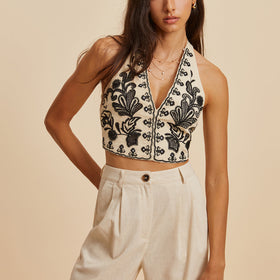 Fudus Stickerei, bedrucktes V-Ausschnitt-Haltertop