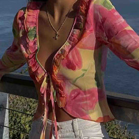 Fudus Top mit V-Ausschnitt, Rüschen und langen Ärmeln
