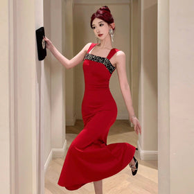 Privates Kleid, Einzelstück. Langer Rock, quadratischer Ausschnitt. Träger-Stil, ärmellos. Sexy Stil, Collage/Zusammensetzung.