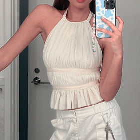 Das Gerafftes Halter-Crop-Top Laine ist ein unverzichtbares Basic, das zartes Design und zeitlosen Charme verbindet. Subtile Rüschen, Neckholder-Ausschnitt und mehrschichtige Details ergeben einen klassisch-modernen Look. Mühelos zu stylen, ideal zu Hosen oder Jeans.