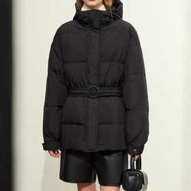 Diese dicke Daunenjacke aus Entendaunen hält Sie auch bei niedrigen Temperaturen warm und stilvoll. Mit ihrer weit geschnittenen Passform, einem Reißverschluss und einem verstellbaren Gürtel sorgt sie für eine feminine Silhouette. Die Kapuze bietet zusätzlichen Schutz vor Kälte, während praktische Taschen und geschnittene Details funktionalen Stil hinzufügen. Erhältlich in vielseitigem Schwarz und Weiß, ist diese Jacke ein unverzichtbares Winter-Basic für kalte Tage.