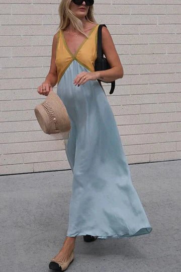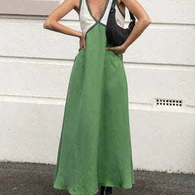Glänzendes Satin-Maxikleid in Kontrastfarben.