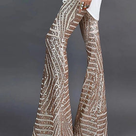 Diese bequeme Hose mit mittelhohem, elastischem Bund und ausgestellter Passform glänzt durch goldenen Glitzer und einen stylischen Aufdruck. Perfekt kombiniert mit Bluse oder Body. Tipp: Fällt klein aus, eine Nummer größer bestellen.