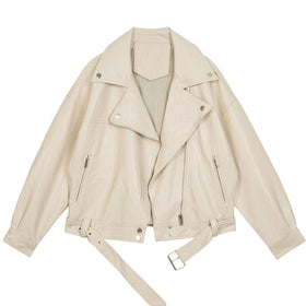 Diese Lederjacke aus Kunstleder bietet einen Reverskragen mit Kerbe, Reißverschlusstaschen und einen Gürtel. Asymmetrischer Reißverschluss und Oversized Passform.