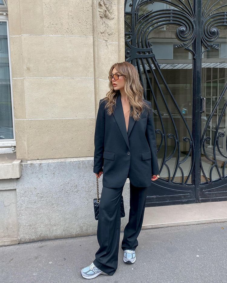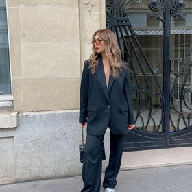 Eleganter, schwarzer Oversized-Blazer mit goldenen Knöpfen. - Großzügige Passform. - Lange Ärmel. - Klassischer Kragen. - Zwei vordere Taschen. - Aus robuster Wolle und weichem Polyester. - Atmungsaktiv. - Vielseitig kombinierbar: für formelle und informelle Anlässe.