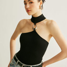 Halter Neck Top with Ring Detail and Ribbed Texture