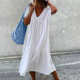 Wunderschönes, schlichtes Kleid mit dezenten Volants für einen femininen Look. Elegant und subtil verziert, ideal für Abendessen, formelle Anlässe oder den Alltag. Hochwertiges Material für angenehmen Tragekomfort. Erhältlich in verschiedenen Größen.
