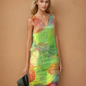 Entdecken Sie den Charme des Herbstes mit dem eleganten Herbstkleid von Rosamund! Dieses ärmellose Kleid feiert die natürliche Schönheit und verkörpert die Essenz der Saison mit einem atemberaubenden Blätterdruck.