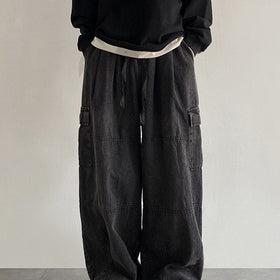 Beschreibung: Gewaschene Denim Jeans mit Skater-Bein, verstellbarem Bund, abgesteppten Nähten, Cargotaschen und Kordelzugbündchen mit Knebelverschlüssen.