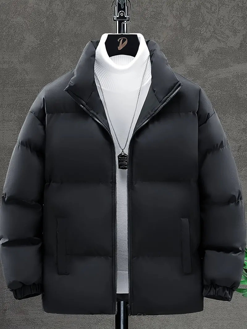 Diese Puffer-Winterjacke vereint modernen Stil mit zuverlässigem Kälteschutz. Der Stehkragen, die gesteppten Panels und die gerippten Bündchen bieten Wärme und ein elegantes Erscheinungsbild. Praktische Reißverschlusstaschen eignen sich ideal für den Alltag und Outdoor-Aktivitäten.