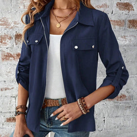 Stilvolle Reißverschlussjacke mit lässigem Komfort und eleganten Details. Hochkrempelbare Ärmel mit Knopfverschluss, Brusttaschen und lockerer Schnitt. - Perfekt für Alltag und besondere Anlässe. - Kombinierbar mit Jeans oder Kleidern.
