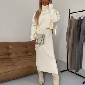 Stilvoller Komfort mit unserem zweiteiligen Set aus Rollkragenpullover und langem ärmellosem Kleid. Hochwertiges Polyester für angenehmen Tragekomfort. Farben: Weiß, Grau, Kamel. Perfekt für modebewusste Frauen. Größen S-2XL. Asiatische Größen fallen kleiner aus; bei Zwischengrößen größere Größe wählen.