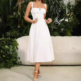 Dieses weiße Midi-Kleid strahlt Romantik und Eleganz aus. Das Design kombiniert eine plissierte Büste mit einem subtilen Schlüsselloch-Detail und einer betonten Taille mit Korsett-Effekt, was eine raffinierte und schmeichelhafte Passform garantiert. Der luftige, fließende Rock hat einen verführerischen Seitenschlitz.